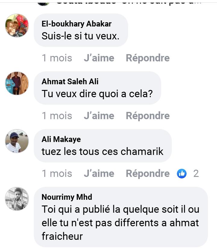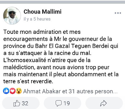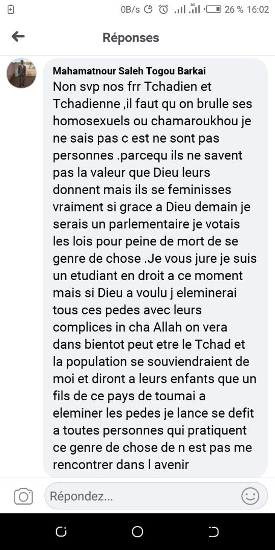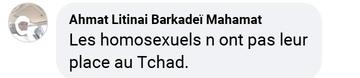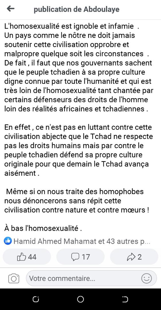 Les médias sociaux, Facebook en particulier, sont le lieu de messages homophobes souvent d’une très grande violence envers les personnes soupçonnées d’homosexualité et envers la minorité LGBT en général. Mais, ce que l’on voit au Tchad, ce sont des messages qui appellent ouvertement au lynchage et à la torture ou qui applaudissent de telles actions. En voici des exemples.