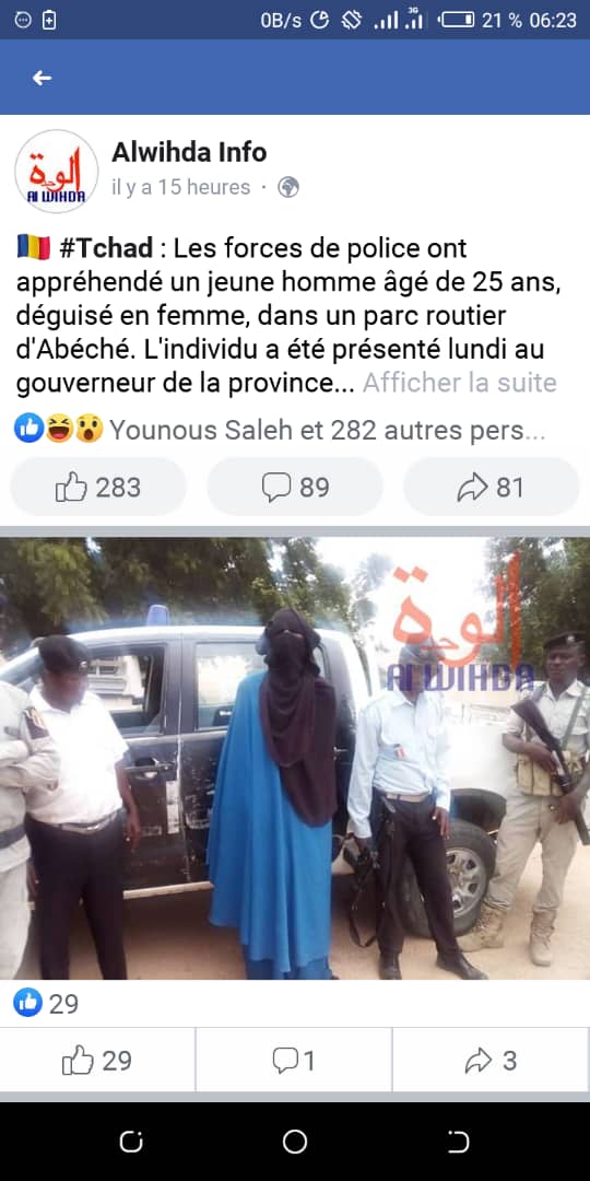 Tchad : un homme suspect habillé en femme arrêté.