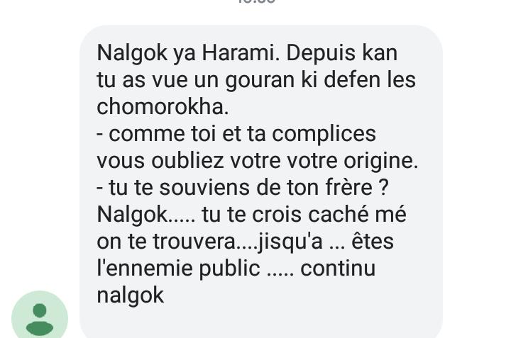 Un autre texto envoyé à un des fondateurs d’Arc-en-ciel Tchad. Chicote signifie fouetter en rabe tchadien. |