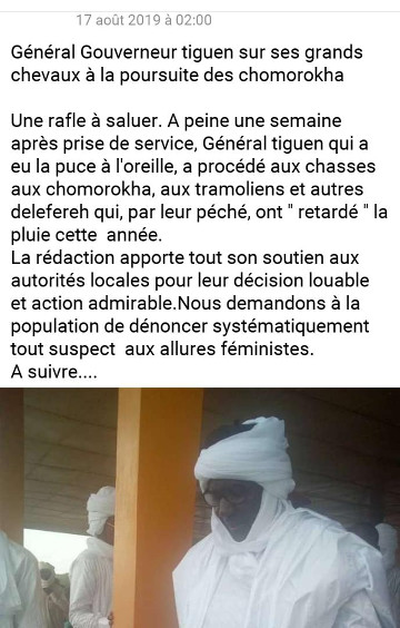 ![]() C’est au début d’aout 2019 que 18 de nos membres ont été emprisonnés à Moussoro sur ordre du général Teguen Idibeï Berdei, alors gouverneur de la région de Bahr El Gazel. Cette rafle sera saluée, sur leur page Facebook, par un groupe de jeunes homophobes de la région, amorçant une campagne de haine et de violence homophobe allant jusqu’au meurtre. chomorokha : désigne en arabe dialectal tchadien, celui qui fait les choses des femmes. C’est l’équivalent du mot homosexuel en français ; |